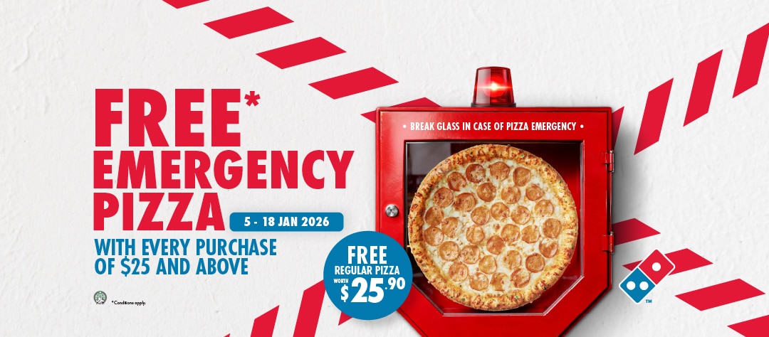 Free Emergency pizza giveaway is from 5 – 18 Jan, 2026 with a min purchase of $25.
