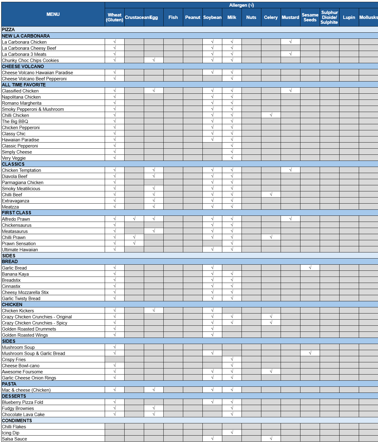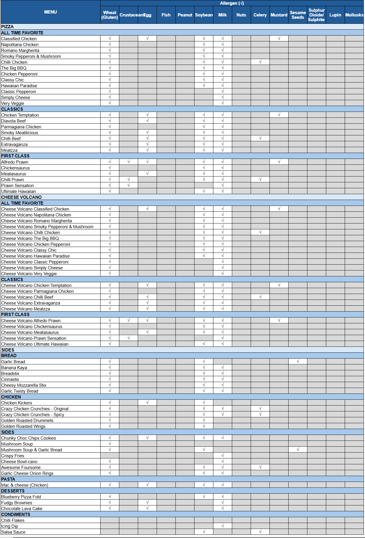 Prawn Sensation, Chilli Prawn and Alfredo Prawn contain Crustaceans.