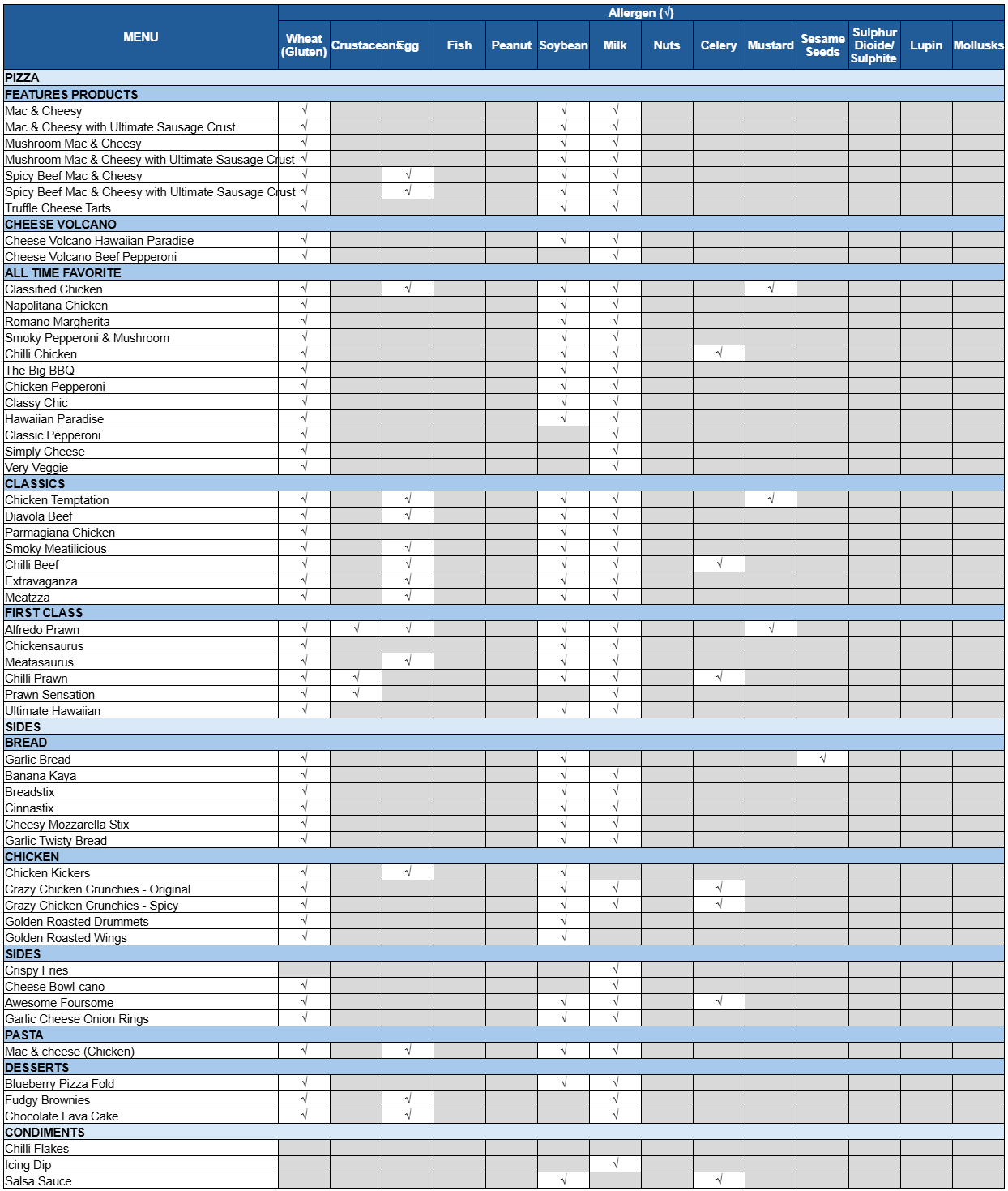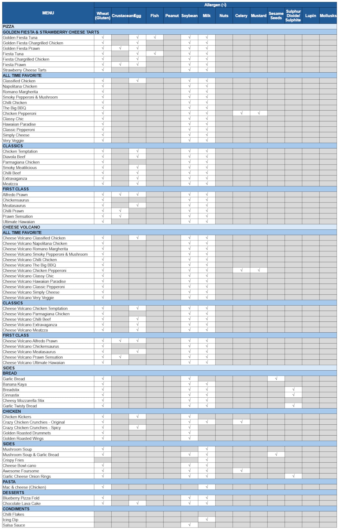 Prawn Sensation, Chilli Prawn and Alfredo Prawn contain Crustaceans.